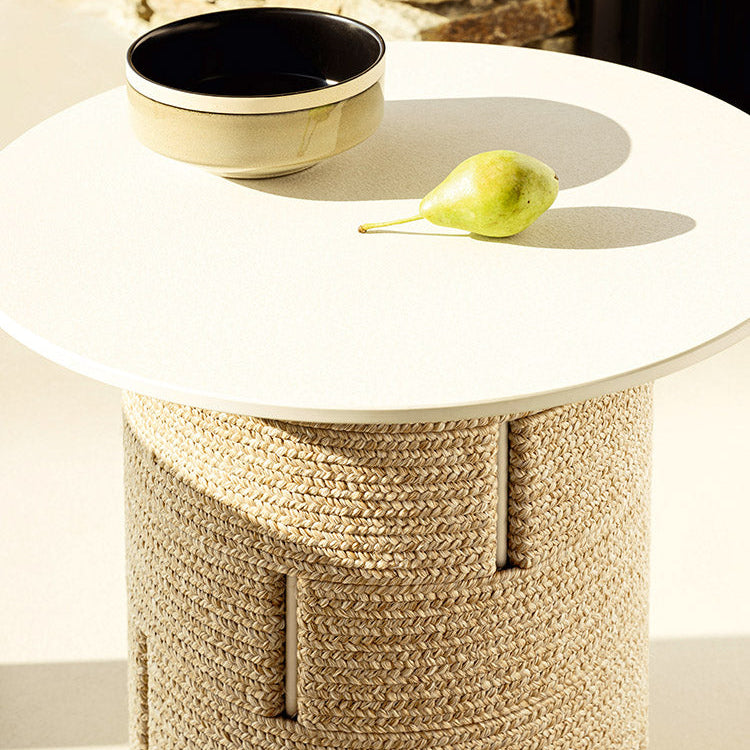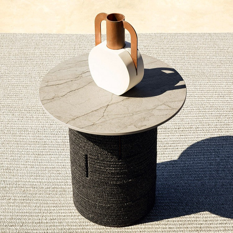 The Gianna Coffee Table / Central Stem Table / Table is characterized by a cylindrical structure in aluminum, the perfect material for outdoor environments, wrapped in an elegant mat covering, available in the Desert and Ghisa colors. The circular tops, of various sizes, are available in both Hpl and bush-hammered ceramic.