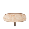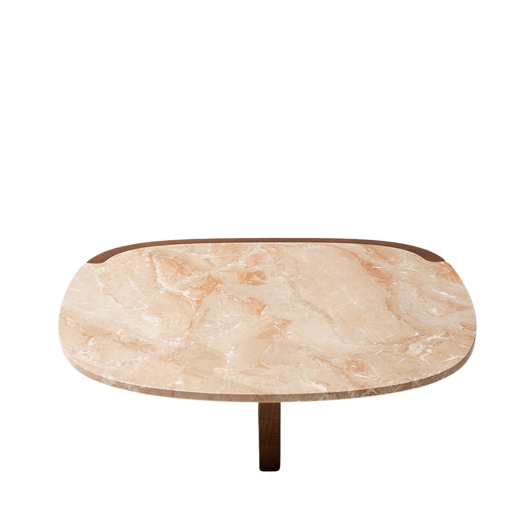 An important wooden base, an almost suspended marble top and a central leg that runs along its entire length, supporting it. Three elements, a meeting of proportions and balances that can be reconfigured in a multitude of cantilevered tables with an asymmetrical design, in which once can see the shapes of a trampoline or the appearance of the famous Falling water house by Frank Lloyd Wright. The tables are available in two sizes and color variants, both with an open-pore solid ash base in order to reveal the grain and intensity of this noble material.