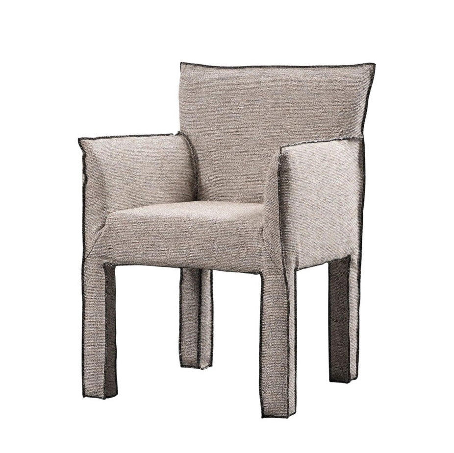 Dining chair characterised by a squared back and legs whose shapes are softened and entirely enveloped by an upholstered cover that runs along the entire seat and highlights its profile and minimalist structure, characterised by clean, defined geometries.