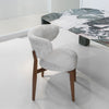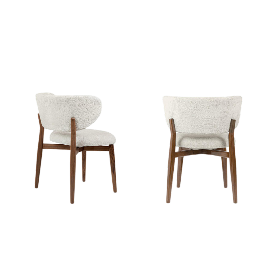 The Raphi armchair, characterised by clean and refined lines, is a stylish addition to any dining area. Its padded seat and backrest, covered with fabric or leather, offer enveloping comfort. The four legs in solid Canaletto walnut, crafted with skill, are connected to each other by a cross motif that gives an elegant visual lightness, making the seat seem suspended in mid-air.