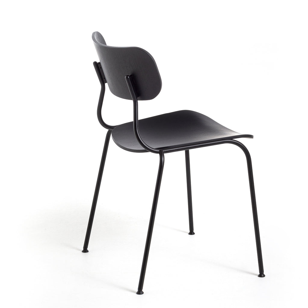4-legs chair with painted steel frame and tinted ash veneered plywood seat and backrest.
