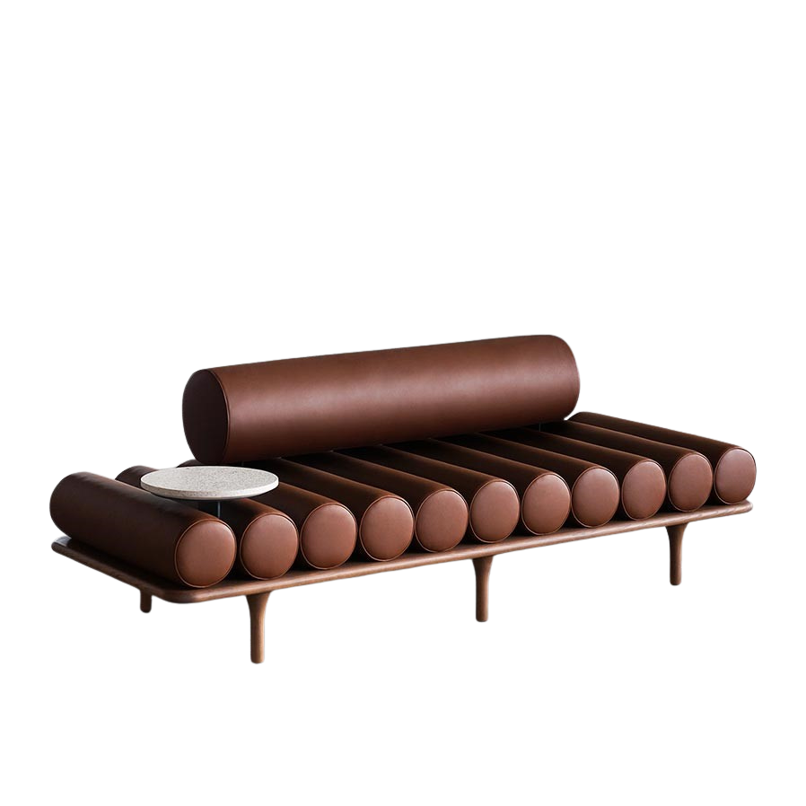 Upholstered in leather, for a minimalist Bauhaus effect, or in mohair velvet for maximum comfort and enveloping softness. The wood seat structure has an open-pore painted finish, with turned legs and achieves its fullest expression once the bolster pillows, one by one, have been set in place, along with the armrest and backrest (available in two sizes), and the round side table with surfaces in concrete or metal, in various colors and finishes for a more textured effect.