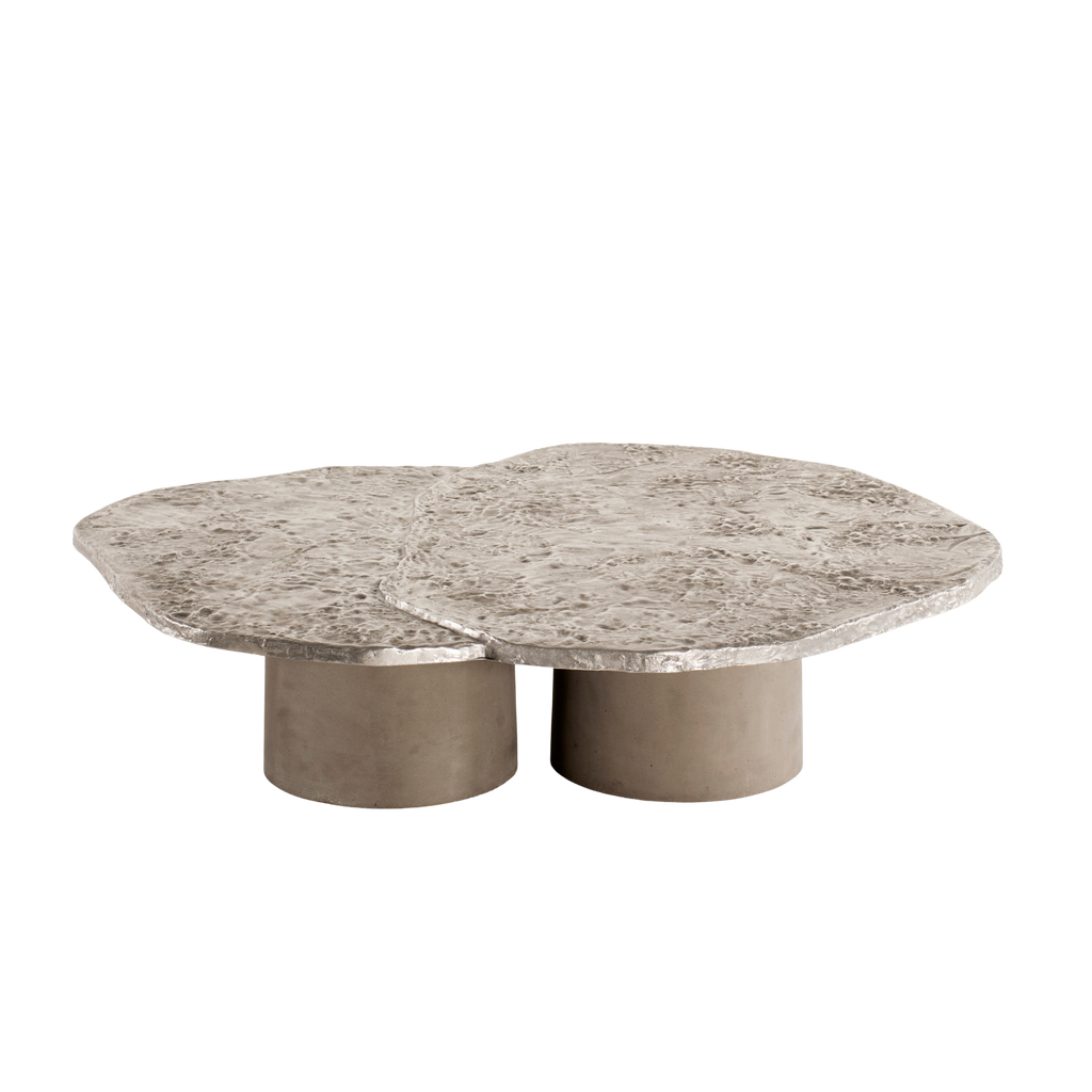 Tacchini's first project with designer Roberto Sironi, this table with a cast aluminum top and concrete legs presents itself as a procedural object, where the material takes over and dominates the forms to give life to a piece with a proud and charismatic personality .