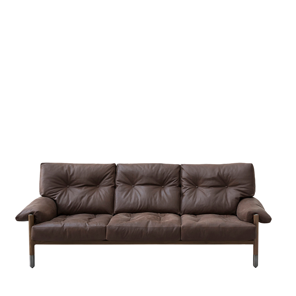 Sella is inspired by the armchair of the same name designed in 1966 by the famous Italian architect Carlo De Carli. The highly elegant sofa is made using the very finest of materials: exposed walnut, elegant metal chromed details finish shiny black and belts for the support of the backrest in refined natural leather. The cushions are filled with feathers, and the coverings could be in leather, fabric or velvet. Its soft, generous line offers the utmost refinement, and is designed to guarantee extraordinary comfort, conducive to a slow tempo that will reconcile us with ourselves and others, in a more intimate and private spatial dimension.