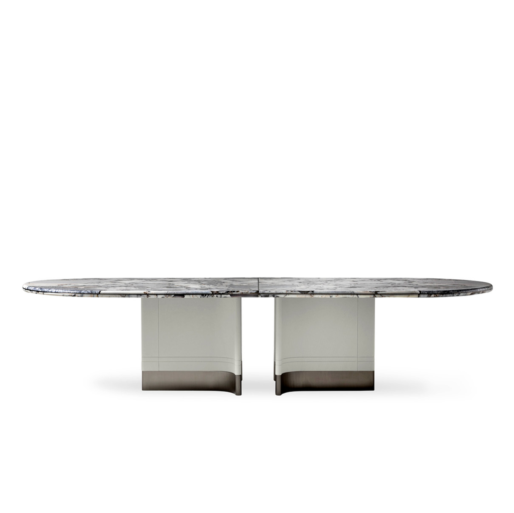 Sophisticated and refined, the table Adone is an elegant protagonist of the dining area. The precious materials used for its realization are further enhanced thanks to the harmonious sinuous shapes. The top, rounded at the ends, is an important block of marble with a metal profile.
