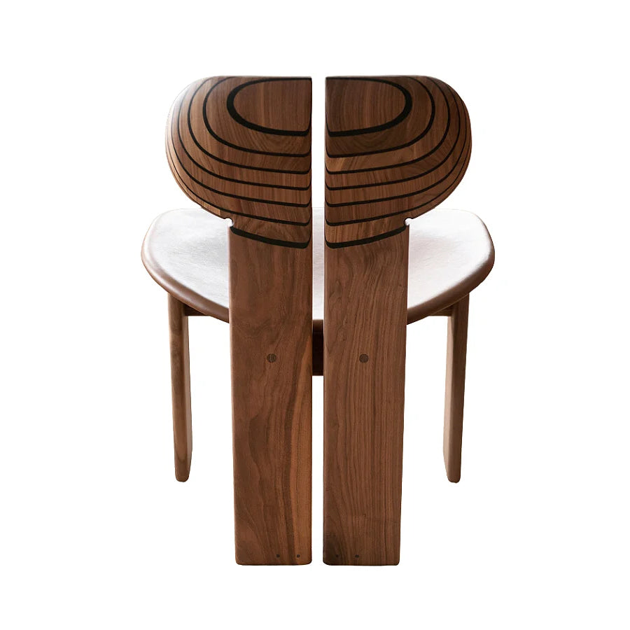 The structure in solid canaletto walnut with a thin rectangular section shows all the expressiveness of the veneer in the progression of the thicknesses that compose it, while the seat is masterfully curved and covered in leather or fabric. The backrest is the true protagonist of the chair: worked as a single piece, and then divided and finished in two mirror-like parts, it features delicate manual roughing and sanding processes from which the layers of different woods emerge, creating wonderful chromatisms thanks to the thin dark threading. The backrest and rear legs are joined only at the base, giving rise to a wide slit that guarantees elasticity to the structure, evoking a totemic image.