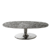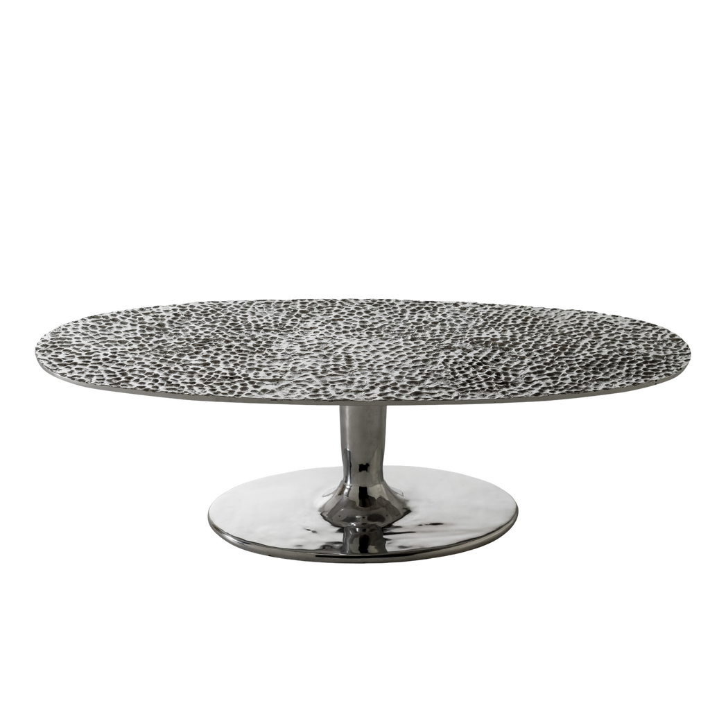 Contrasts of light and reflections characterise the Next 147/148 coffee table family. Made entirely of polished cast aluminium, in different sizes and heights, they are characterised by a single central base that joins an oval top embellished and decorated with a hammered effect. The gloss of the surface allows the light to create different effects every time.