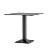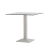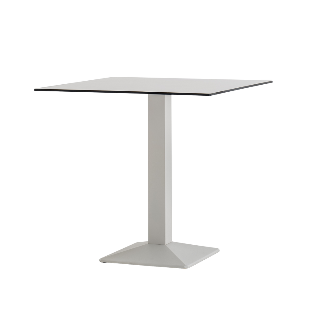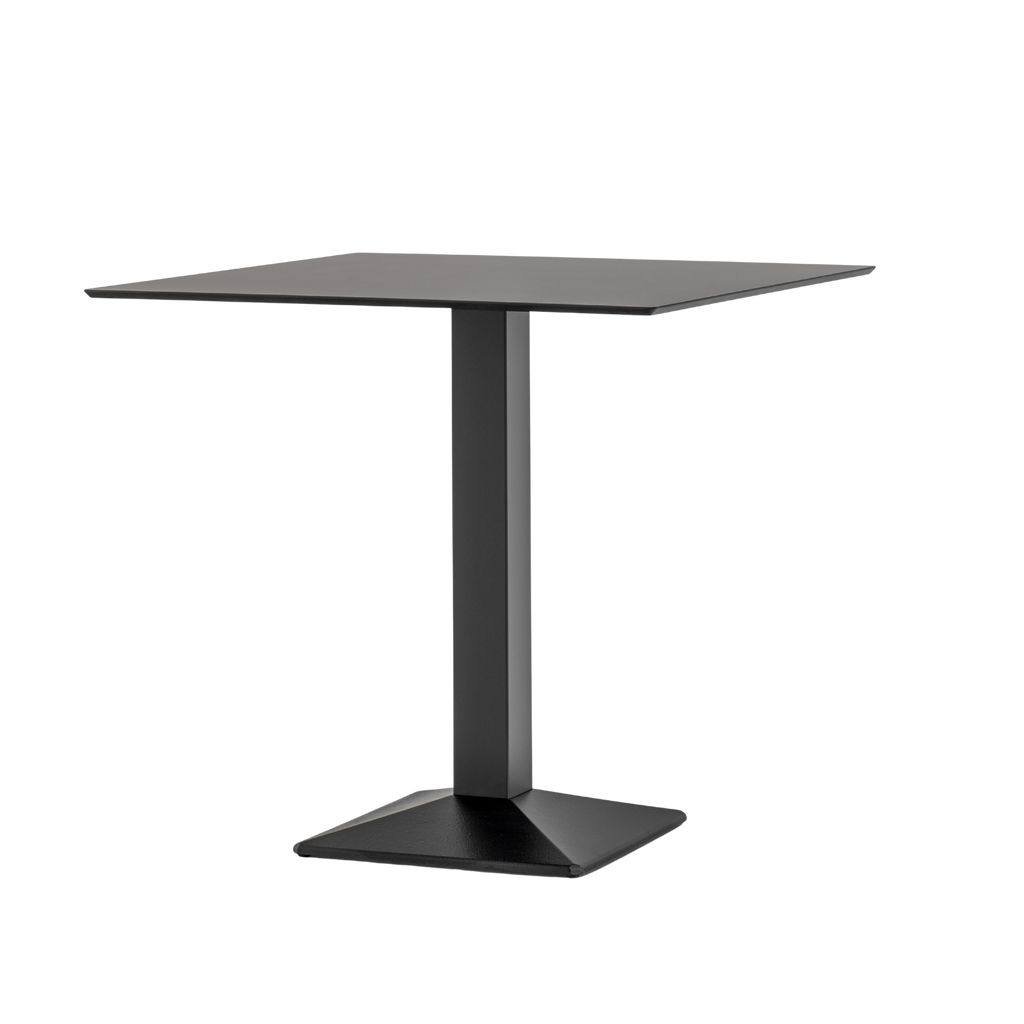 Perfect expression of solid geometry, Quadra table is symbol of stability and functionality. Table with a pyramid-shaped, powder coated, sand-blasted cast-iron base and steel tube column. Available combined with square tops of different sizes and finishes.