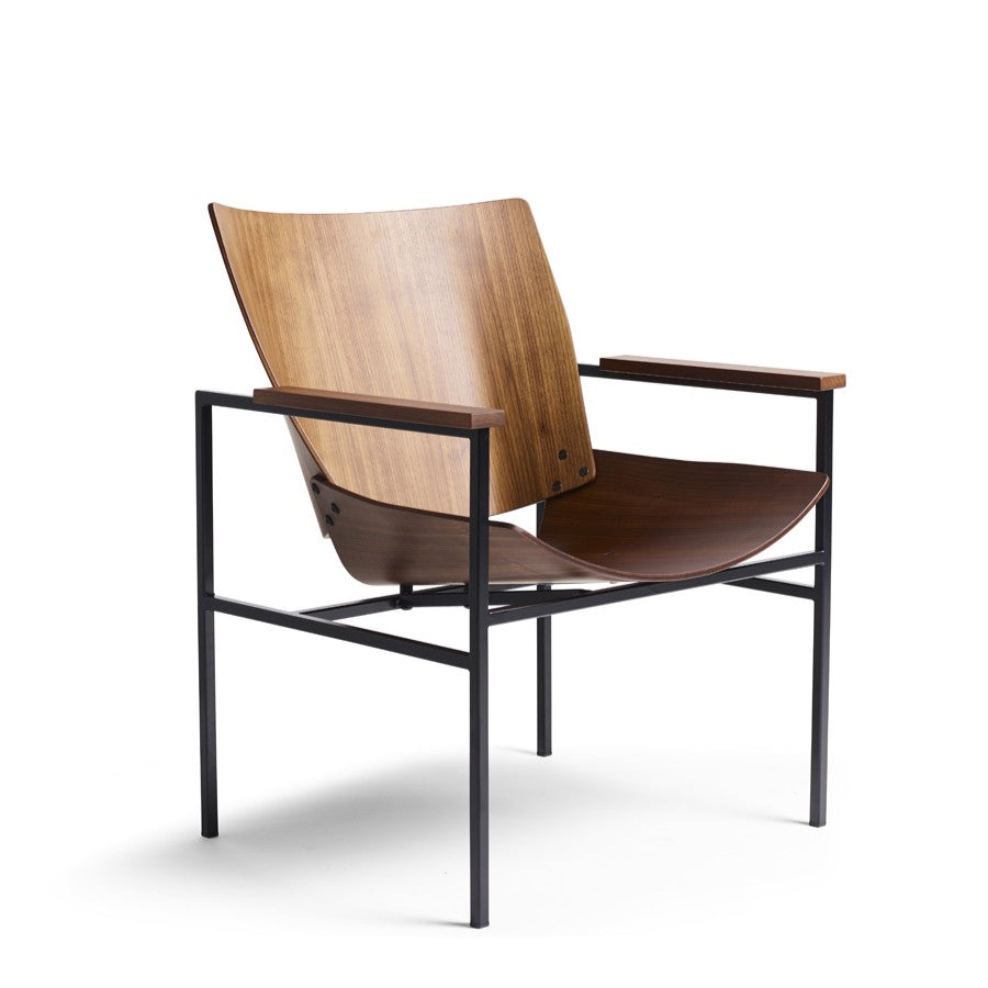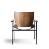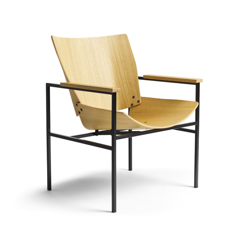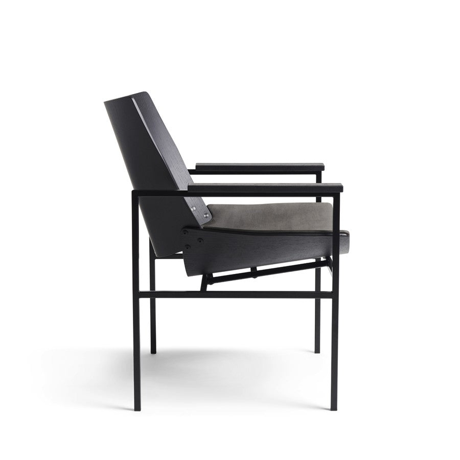 Materials: Lounge armchair, black powder coated steel frame. Upholstered seat and back