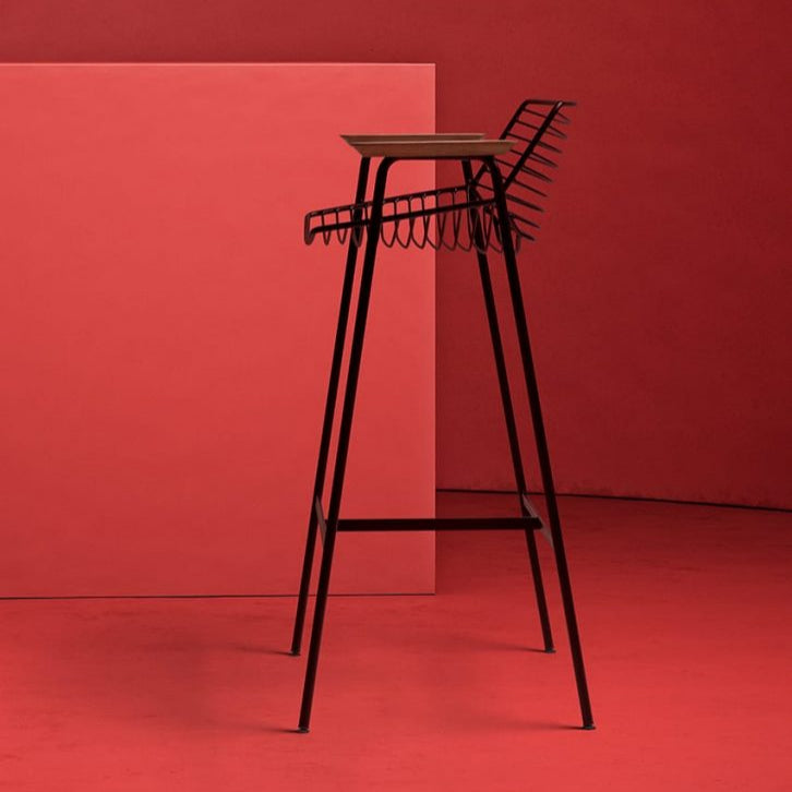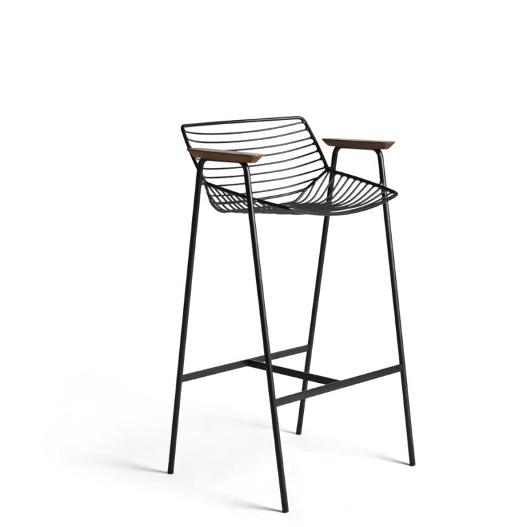Materials: Barstool with armrests in iroko, embossed painted steel frame, in the colours